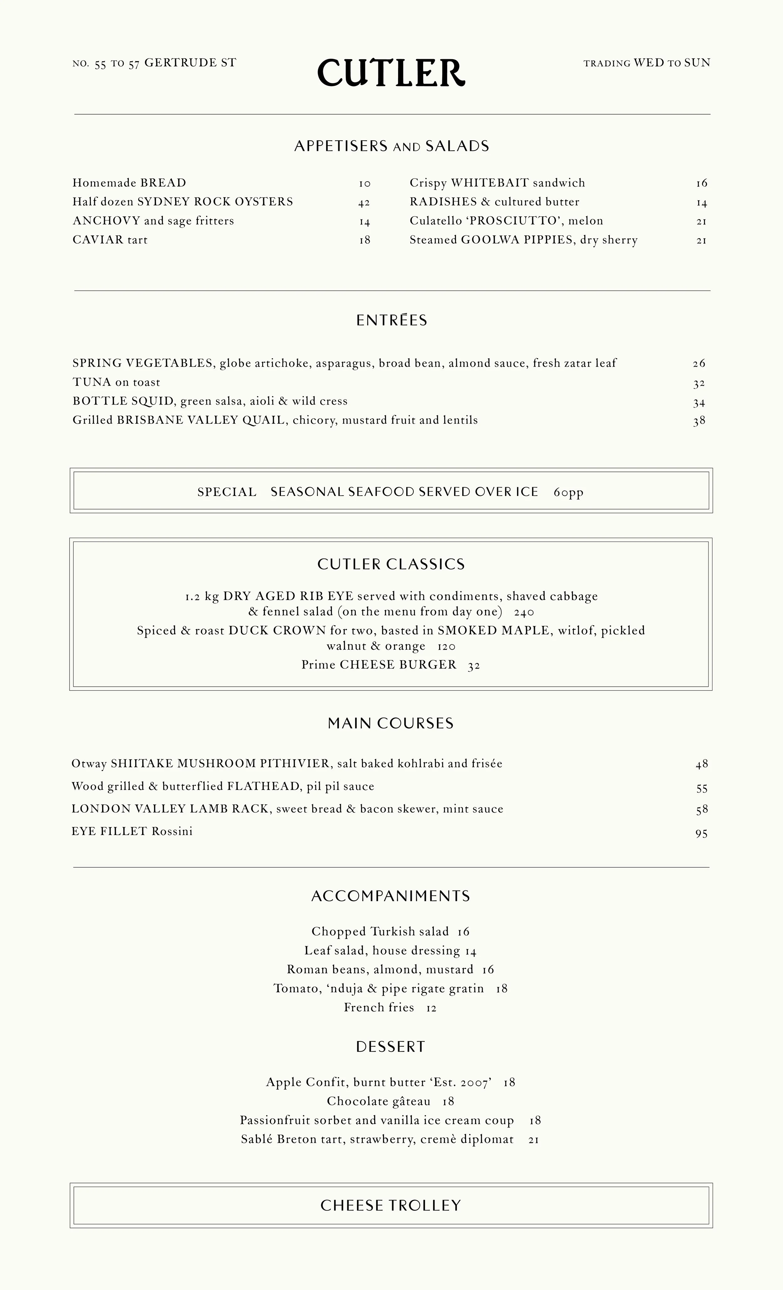 The season brings an abundance of produce and is the perfect time to take stock and evolve. Our new menu reflects how we like to cook, dine and eat right now. It is spontaneous, thoughtful and modern cooking, while at the same time referencing and highlighting not only the best of the season but also some of our most lauded classic dishes.